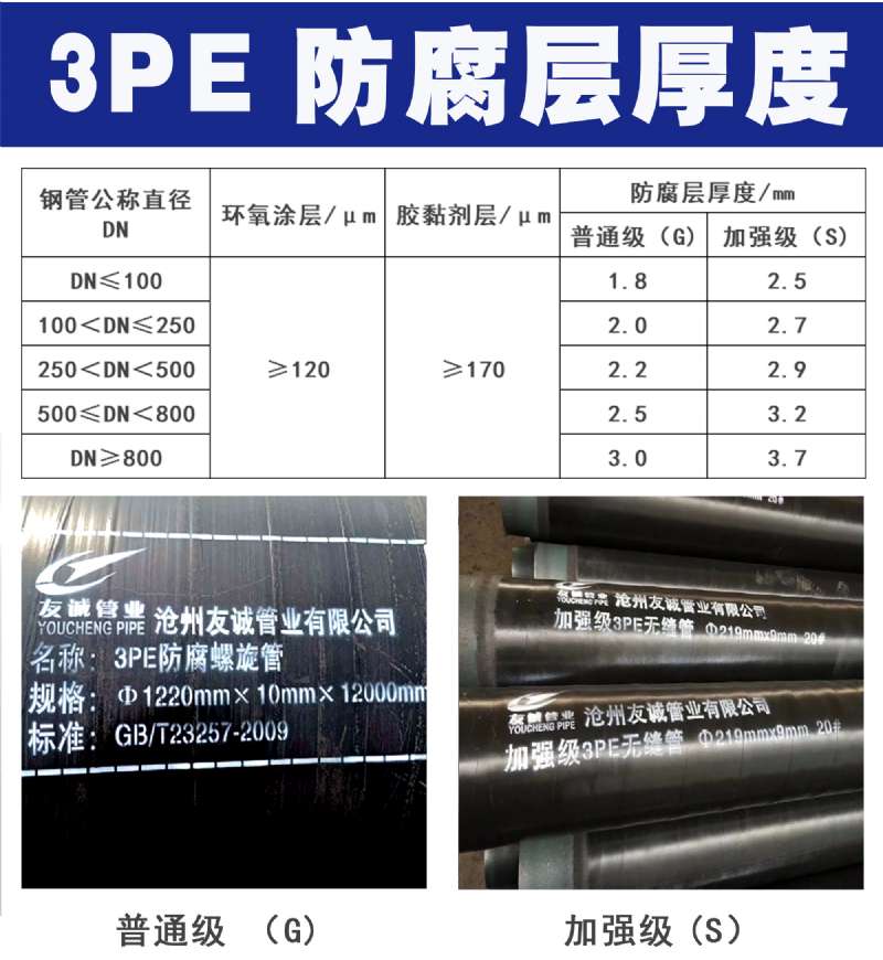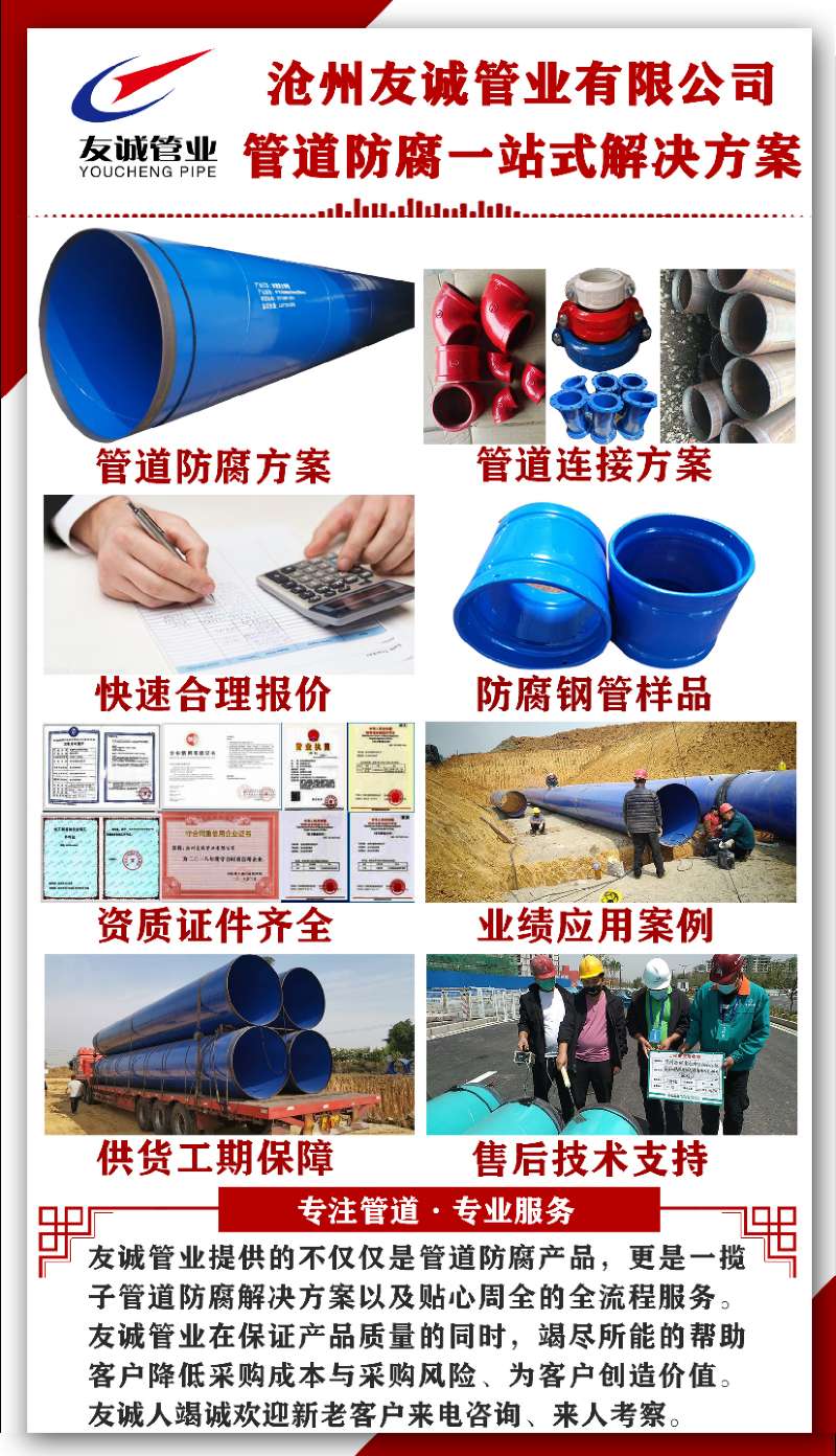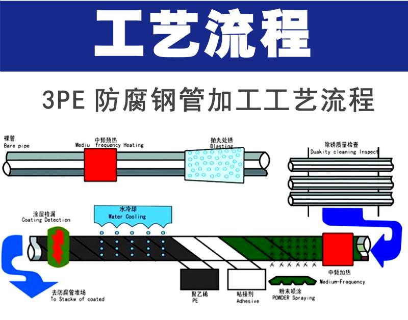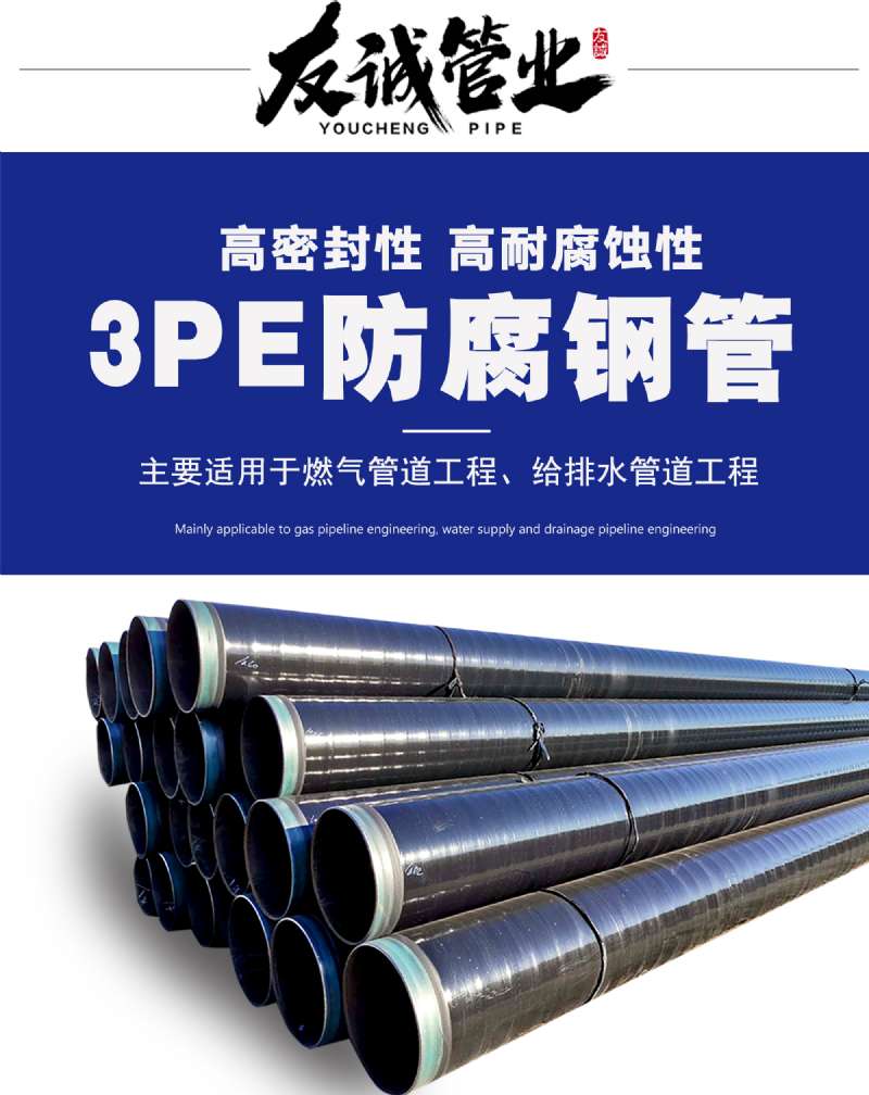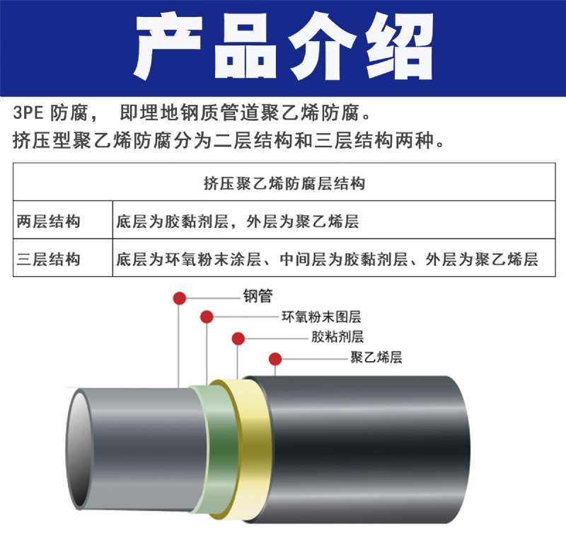 三層防腐結構組成包括: 熔結環氧粉末底層、聚合物膠粘劑中間層和聚乙烯面層,其中環氧粉末底層的作用是形成連續的涂膜,與鋼管表面粘結、固化而提供良好的附著力,并具有很好的耐化學品性和抗陰極剝離能力;聚合物膠粘劑的作用是在環氧粉末涂料膠化之前與之融合,并與外面的聚乙烯層粘結