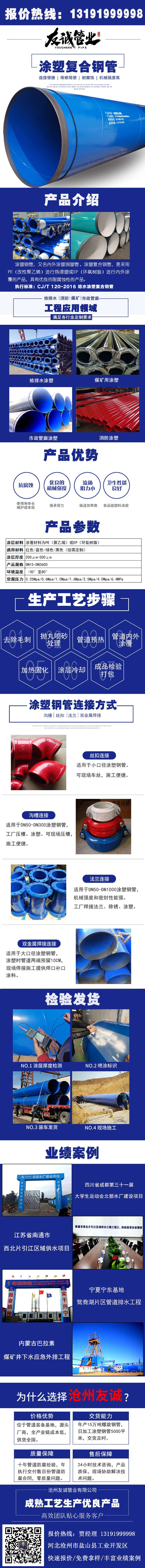 給水涂塑鋼管,又名鋼塑復(fù)合管、涂塑復(fù)合鋼管,是采用PE(改性聚乙烯)進(jìn)行熱浸塑或EP(環(huán)氧樹(shù)脂)進(jìn)行內(nèi)外涂覆的產(chǎn)品,具有優(yōu)良的耐腐蝕性能。同時(shí)涂層本身還具有良好的電氣絕緣性,不會(huì)產(chǎn)生電蝕。吸水率低,機(jī)械強(qiáng)度高,摩擦系數(shù)小,能夠達(dá)到長(zhǎng)期使用的目的。還能有效的防止植物根系及土壤環(huán)境應(yīng)力的破壞等。連