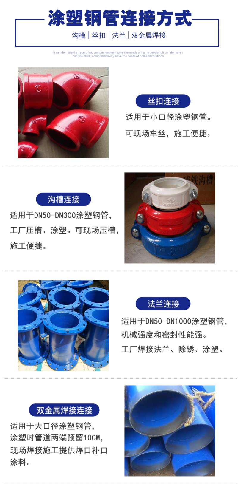 涂塑管,又名鋼塑復合管、涂塑復合鋼管,是采用PE(改性聚乙烯)進行熱浸塑或EP(環(huán)氧樹脂)進行內(nèi)外涂覆的產(chǎn)品,具有優(yōu)良的耐腐蝕性能。同時涂層本身還具有良好的電氣絕緣性,不會產(chǎn)生電蝕。吸水率低,機械強度高,摩擦系數(shù)小,能夠達到長期使用的目的。還能有效的防止植物根系及土壤環(huán)境應力的破壞等。連接便捷、維修簡便。